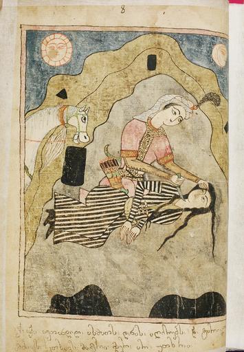 | Keywords: H599, tavaqarashviliseuli vefxistkasoani, avtandili asmats danit ashinebs, 76v.jpg en avtandili asmats danit ashinebs A miniature by Mamuka Tavakalashvili from the manuscript of Shota Rustaveli's Knight in the Panther's Skin H599 76v National Center of Manuscripts Tbilisi Georgia ka แแแแแ แแแแ แแกแแแแก แแแ แแ แแจแแ แแแก http //www flickr com/photos/36292139 N03/3350299057/sizes/l/in/photostream/ Machavariani H Aleksidze Z The Decoration of Georgian Manuscripts Tbilisi 1990 creator Mamuka Tavakalashvili century 17 PD-old-100 The Knight in the Panther's Skin by Mamuka Tavakalashvili Georgia in the 17th century |