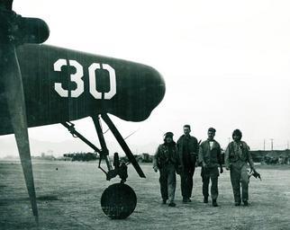 | Keywords: outdoor NH 97104. Grumman F7F "Tigercat" Night Figher, of Marine aircraft squadron VMF-513. "Marine Corps Night Fighters in Korea -- Mechanics assigned the care of the F7F flown by Long and Woodward as part of Marine Night Fighter Squadron VMF 513 meet the men as dusk sets in and the F7F Tiger Cats prepare to leap on their prey from the black skies over Korea." "(left to right) Pilot Long, USMC; Cpl. T.R. Moore, ...; Sgt. T. R. Choate, USMC; ... Warrant Officer Woodworth." Photograph and caption released by Commander Naval Forces, Far East, under date of 26 May 1951. Note that the two sentences use different spellings of the last man's name. Official U.S. Navy Photograph, from the "All Hands" collection at the Naval History and Heritage Command. NH 97104. Grumman F7F "Tigercat" Night Figher, of Marine aircraft squadron VMF-513. "Marine Corps Night Fighters in Korea -- Mechanics assigned the care of the F7F flown by Long and Woodward as part of Marine Night Fighter Squadron VMF 513 meet the men as dusk sets in and the F7F Tiger Cats prepare to leap on their prey from the black skies over Korea." "(left to right) Pilot Long, USMC; Cpl. T.R. Moore, ...; Sgt. T. R. Choate, USMC; ... Warrant Officer Woodworth." Photograph and caption released by Commander Naval Forces, Far East, under date of 26 May 1951. Note that the two sentences use different spellings of the last man's name. Official U.S. Navy Photograph, from the "All Hands" collection at the Naval History and Heritage Command. |
