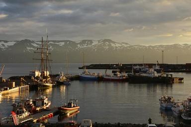 Keywords: húsavík port sea coast bank ships sailing ships boats abendstimmung landscape nature atmospheric water skjálfandibucht fishing port