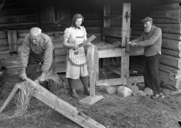 | Keywords: håndverk jordbruk kultur kulturminner landbruk mennesker museer verktøy og redskaper verktøyogredskaper oppland norge nor blackandwhite monochrome black and white En kvinne og to menn arbeider med lin foran en linbadstu. Opprinnelig var denne badstuen fra gården Dile i Vestre Gran. En kvinne og to menn arbeider med lin foran en linbadstu. Opprinnelig var denne badstuen fra gården Dile i Vestre Gran. | ||||