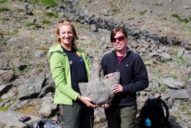 | Keywords: fossils geology paleontology petrified wood tracks trackway national park service nationalparkservice outdoor Paleontology GIPs at Denali National Park & Preserve, Alasaka, Mariah Richards and Nancy Parker, with a large hadrosaur footprint. (NPS Photo by Mariah Richards, GIP) Paleontology GIPs at Denali National Park & Preserve, Alasaka, Mariah Richards and Nancy Parker, with a large hadrosaur footprint. (NPS Photo by Mariah Richards, GIP) | ||||