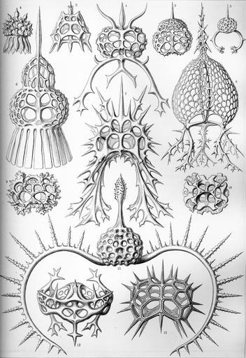 | Keywords: Haeckel Spyroidea.jpg See full-size image for numbers Triceraspyris gazella <small> Haeckel </small> Triceraspyris sp skeleton in side view Clathrospyris pyramidalis <small> Haeckel </small> Clathrospyris sp skeleton in side view Pylospyris canariensis <small> Haeckel </small> Peromelissa sp skeleton in side view Anthospyris mammillata <small> Haeckel </small> Triospyrididae sp skeleton in side view Dendrospyris polyrrhiza <small> Haeckel </small> Dendrospyris sp skeleton in side view Sepalospyris pagoda <small> Haeckel </small> Polycystina sp skeleton in side view Elaphospyris cervicornis <small> Haeckel </small> Spyridae sp skeleton in side view Tholospyris cupola <small> Haeckel </small> Androspyris ramosa <small> Haeckel 1887 </small> skeleton in side view Dictyospyris stalactites <small> Haeckel </small> Dictyospyris sp skeleton in side view Dictyospyris anthophora <small> Haeckel </small> Tholospyris anthophora <small> Haeckel 1887 </small> skeleton in side view Dorcadospyris dinoceras <small> Haeckel </small> Dorcadospyris sp skeleton in side view Triceraspyris damaecornis <small> Haeckel </small> Clathrocircus stapedius <small>Haeckel 1887</small> skeleton in top view Ceratospyris Strasburgeri <small> Haeckel </small> Lophospyris pentagona pentagona <small> Ehrenberg 1872 </small> skeleton in side view Kunstformen der Natur 1904 plate 22 Spyroidea see http //caliban mpiz-koeln mpg de/haeckel/kunstformen/high/Tafel_022_300 html here http //caliban mpiz-koeln mpg de/haeckel/kunstformen/high/Tafel_022_text_1_200 html here and http //caliban mpiz-koeln mpg de/haeckel/kunstformen/high/Tafel_022_text_2_200 html here creator Ernst Haeckel 1904 public domain due to age PD-old Kunstformen der Natur 1904 Radiolaria |