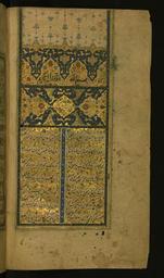 | Keywords: Hafiz - Illuminated Incipit Page with Headpiece - Walters W6291B - Full Page.jpg This page from Walters manuscript W 629 has an illuminated headpiece inscribed wa-Llah khayr hafiz The main text is decorated with interlinear illumination with polychrome motifs The vertical divider is illuminated with floral motifs on a blue ground The headpiece and written surface are surrounded by a dark blue band with white crosses and an illuminated frame islamic 1552 958 Safavid ink and pigments on buff and rose-tinted laid paper cm 20 5 12 accession number W 629 1B 81379 Mustafá Pasha Vali-i Iskandariyah prior to 1231 mode of acquisition unknown dated 1231 see fol 1a Hasan Haqqi 1285 mode of acquisition unknown see fol 1a Hasan Haqqi Vali-i Salanik 1303 mode of acquisition unknown see fol 1a Henry Walters Baltimore date and mode of acquisition unknown Walters Art Museum Henry Walters Acquired by Henry Walters place of origin Iran Walters Art Museum license 2D Divan by Hafez Safavid Walters MS 629 |