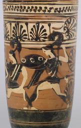 | Keywords: Haimon Painter - Three Amazons and Herakles - Walters 48241 - Right Detail.jpg Herakles is depicted on this black-figure lekythos with his usual attributes the lion skin and the club which he holds in his right hand and a quiver He is facing right grasping an Amazon who tries to escape from him though she turns her head to face him There is an Amazon on each side of this duel One runs away from Herakles while the other runs toward his captive as if coming to her aid All three are similarly dressed; two carry spears; one has no shield Herakles' ninth labor for King Eurytheus required him to retrieve the girdle of the queen of the Amazons While the queen at first willingly acceded to Herakles' request the goddess Hera spread a rumor among the Amazons that Herakles intended to kidnap their queen; when the Amazons attacked him Herakles killed her and made off with her girdle This theme was a common subject on vases depicting the Amazons and one of the most frequently recurring subjects on vases portraying Herakles and his labors In vase-painting the Amazon queen is usually named Andromache she is more often named Hippolyte in the literary evidence and the girdle itself is usually not depicted until after the 6th century ca 525 475 BC terracotta cm 27 8 2 accession number 48 241 27241 Joseph Brummer New York date and mode of acquisition unknown Henry Walters city Baltimore Walters Art Museum Henry Walters Acquired by Henry Walters 1924 Heroes Mortals and Myths in Ancient Greece The Walters Art Museum Baltimore; Frist Center for the Visual Arts Nashville; San Diego Museum Of Art San Diego; Alexander S Onassis Public Benefit Foundation USA New York 2009-2011 place of origin Attica Greece Walters Art Museum license Ancient Greek black-figure pottery in the Walters Art Museum Haimon Painter Media contributed by the Walters Art Museum needs category review Media contributed by the Walters Art Museum needs artist update Amazonomachy in ancient Greek pottery |