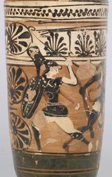 | Keywords: Haimon Painter - Three Amazons and Herakles - Walters 48241 - Left Detail.jpg Herakles is depicted on this black-figure lekythos with his usual attributes the lion skin and the club which he holds in his right hand and a quiver He is facing right grasping an Amazon who tries to escape from him though she turns her head to face him There is an Amazon on each side of this duel One runs away from Herakles while the other runs toward his captive as if coming to her aid All three are similarly dressed; two carry spears; one has no shield Herakles' ninth labor for King Eurytheus required him to retrieve the girdle of the queen of the Amazons While the queen at first willingly acceded to Herakles' request the goddess Hera spread a rumor among the Amazons that Herakles intended to kidnap their queen; when the Amazons attacked him Herakles killed her and made off with her girdle This theme was a common subject on vases depicting the Amazons and one of the most frequently recurring subjects on vases portraying Herakles and his labors In vase-painting the Amazon queen is usually named Andromache she is more often named Hippolyte in the literary evidence and the girdle itself is usually not depicted until after the 6th century ca 525 475 BC terracotta cm 27 8 2 accession number 48 241 27241 Joseph Brummer New York date and mode of acquisition unknown Henry Walters city Baltimore Walters Art Museum Henry Walters Acquired by Henry Walters 1924 Heroes Mortals and Myths in Ancient Greece The Walters Art Museum Baltimore; Frist Center for the Visual Arts Nashville; San Diego Museum Of Art San Diego; Alexander S Onassis Public Benefit Foundation USA New York 2009-2011 place of origin Attica Greece Walters Art Museum license Ancient Greek black-figure pottery in the Walters Art Museum Haimon Painter Media contributed by the Walters Art Museum needs category review Media contributed by the Walters Art Museum needs artist update Amazonomachy in ancient Greek pottery |
