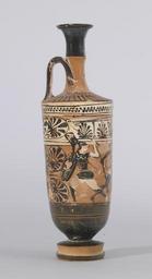| Keywords: Haimon Painter - Three Amazons and Herakles - Walters 48241 - Left.jpg Herakles is depicted on this black-figure lekythos with his usual attributes the lion skin and the club which he holds in his right hand and a quiver He is facing right grasping an Amazon who tries to escape from him though she turns her head to face him There is an Amazon on each side of this duel One runs away from Herakles while the other runs toward his captive as if coming to her aid All three are similarly dressed; two carry spears; one has no shield Herakles' ninth labor for King Eurytheus required him to retrieve the girdle of the queen of the Amazons While the queen at first willingly acceded to Herakles' request the goddess Hera spread a rumor among the Amazons that Herakles intended to kidnap their queen; when the Amazons attacked him Herakles killed her and made off with her girdle This theme was a common subject on vases depicting the Amazons and one of the most frequently recurring subjects on vases portraying Herakles and his labors In vase-painting the Amazon queen is usually named Andromache she is more often named Hippolyte in the literary evidence and the girdle itself is usually not depicted until after the 6th century ca 525 475 BC terracotta cm 27 8 2 accession number 48 241 27241 Joseph Brummer New York date and mode of acquisition unknown Henry Walters city Baltimore Walters Art Museum Henry Walters Acquired by Henry Walters 1924 Heroes Mortals and Myths in Ancient Greece The Walters Art Museum Baltimore; Frist Center for the Visual Arts Nashville; San Diego Museum Of Art San Diego; Alexander S Onassis Public Benefit Foundation USA New York 2009-2011 place of origin Attica Greece Walters Art Museum license Ancient Greek black-figure pottery in the Walters Art Museum Haimon Painter Media contributed by the Walters Art Museum needs category review Media contributed by the Walters Art Museum needs artist update |