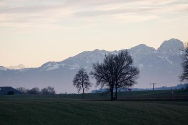 Keywords: hair dryer landscape mountains alpine upper bavaria autumn trees blue grey haze distant view sky nature clouds