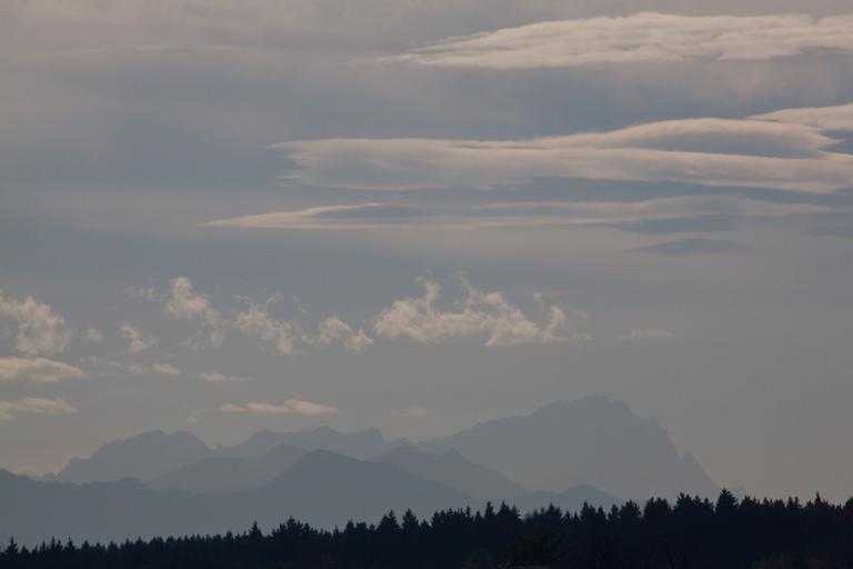 Keywords: hair dryer landscape mountains alpine upper bavaria autumn trees blue grey distant view sky nature zugspitze clouds föhn clouds
