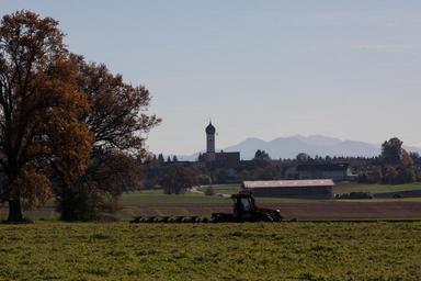Keywords: hair dryer village landscape mountains alpine upper bavaria autumn trees blue green yellow orange distant view sky nature tractor plow