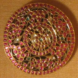 | Keywords: Hair ornament, Tamil Nadu, India, 19th century, gold, rubies, emeralds, and clear stones, Honolulu Academy of Arts.JPG en Hair ornament Tamil Nadu India 19th century gold rubies emeralds and clear stones Honolulu Academy of Arts own Hiart photo 2011 Art of India in the Honolulu Museum of Art Gold jewellery of India Hair ornaments Jewellery of Tamil Nadu Ornaments in Tamil Nadu Cc-zero | ||||