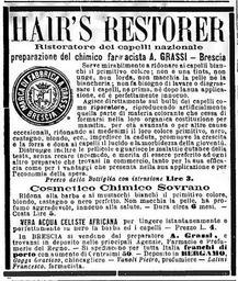 | Keywords: Hairs-restorer-Grassi-Brescia-1886.jpg it Inserzione pubblicitaria del chimico A Grassi di Brescia del 8 5 1886 su la Gazzetta Provinciale di Bergamo Italia - Hair restorer - ristoratore dei capelli nazionale Gazzetta provinciale di Bergamo 8 5 1886 A Grassi Brescia 8 5 1886 it HAIRS ™S RESTORER Ristoratore dei capelli nazionale Preparazione del chimico farmacista A GRASSI “ Brescia Serve mirabilmente a ridonare ai capelli bianchi il primitivo colore; non è una tinta non unge non lorda non macchia la pelle né la biancheria; non fa bisogno di lavare o digrassare i capelli ne prima ne dopo la sua applicazione ed è perfettamente innocuo Agisce direttamente sui bulbi dei capelli come riparatore riproducendo artificialmente quella parte di materia colorante che cessa di formarsi nella loro organica costituzione per malattia per età avanzata o per altre cause eccezionali ridonando ai medesimi il loro colore primitivo nero castagno biondo ecc impedisce la caduta promuove la crescita e la forza e dona ai capelli il lucido e la morbidezza della gioventù Distrugge inoltre le pellicole e guarisce le malattie cutanee della testa senza recare incomodo e merita di essere preferito ad ogni altro preparato che trovasi in commercio tanto per la sua efficacia come per i vantaggi che presenta nella sua applicazione e per l ™economia della spesa Prezzo della Bottiglia con istruzione LIRE 3 COSMETICO CHIMICO SOVRANO Ridona alla barba e ai mustacchi bianchi il primitivo colore biondo castagno o nero perfetto Non macchia la pelle ha profumo aggradevole innocuo alla salute - Dura circa 6 mesi - Costa Lire 5 VERA ACQUA CELESTE AFRICANA per tingere istantaneamente e perfettamente in nero la barba ed i capelli “ Prezzo L 4 In BRESCIA si vendono dal preparatore A GRASSI e trovansi in deposito nelle principali Agenzie Farmacie e Profumerie del Regno “ Si spediscono per tutta Italia franchii di porto con aumento di Centesimi 50 - Deposito in BERGAMO Goggi Grazioso chincagliere “ Vanoli Pietro profumiere “ Latini Francesco farmacista PD-old ImageNote 1 71 76 1154 1375 1291 1522 2 HAIRS ™S RESTORER Ristoratore dei capelli nazionale Preparazione del chimico farmacista A GRASSI “ Brescia Serve mirabilmente a ridonare ai capelli bianchi il primitivo colore; non è una tinta non unge non lorda non macchia la pelle né la biancheria; non fa bisogno di lavare o digrassare i capelli ne prima ne dopo la sua applicazione ed è perfettamente innocuo Agisce direttamente sui bulbi dei capelli come riparatore riproducendo artificialmente quella parte di materia colorante che cessa di formarsi nella loro organica costituzione per malattia per età avanzata o per altre cause eccezionali ridonando ai medesimi il loro colore primitivo nero castagno biondo ecc impedisce la caduta promuove la crescita e la forza e dona ai capelli il lucido e la morbidezza della gioventù Distrugge inoltre le pelicole e guarisce le malattie cutanee della testa senza recare incomodo e merita di essere preferito ad ogni altro preparato che trovasi in commercio tanto per la sua efficacia come per i vantaggi che presenta nella sua applicazione e per l ™economia della spesa Prezzo della Bottiglia con istruzione LIRE 3 COSMETICO CHIMICO SOVRANO Ridona alla barba e ai mustacchi bianchi il primitivo colore biondo castagno o nero perfetto Non macchia la pelle ha profumo aggradevole innocuo alla salute - Dura circa 6 mesi - Costa Lire 5 VERA ACQUA CELESTE AFRICANA per tingere istantaneamente e perfettamente in nero la barba ed i capelli “ Prezzo L 4 In BRESCIA si vendono dal preparatore A GRASSI e trovansi in deposito nelle principali Agenzie Farmacie e Profumerie del Regno “ Si spediscono per tutta Italia franchii di porto con aumento di Centesimi 50 - Deposito in BERGAMO Goggi Grazioso chincagliere “ Vanoli Pietro profumiere “ Latini Francesco farmacista ImageNoteEnd 1 Hair lotion advertising 1886 Advertisements in Italy 1886 advertisements in Italy |