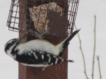 Keywords: michigan birds michiganbirds michigan bird hairy woodpecker hairywoodpecker feeder winter snow Think this is a Hairy or Downy woodpecker. Think this is a Hairy or Downy woodpecker.