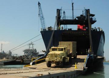 | Keywords: Haiti Relief DVIDS253588.jpg en Service members conducting joint logistics over the shore operations at the main seaport in Port-au-Prince Haiti off-load construction vehicles and equipment assigned to the U S Army 7th Sustainment Brigade from the British-flagged Crowley Shipper Several U S and international military and non-governmental agencies are conducting humanitarian and disaster relief operations as part of Operation Unified Response after a 7 0-magnitude earthquake caused severe damage in and around Port-au-Prince Haiti Jan 12 2010-02-20 Petty Officer 2nd Class Kimberly Martinez https //www dvidshub net/image/253588 100220-N-+++++-116 2010-02-23 05 57 PORT-AU-PRINCE HT PD-USGov-Military-Navy Operation Unified Response Images from DoD uploaded by Fæ |