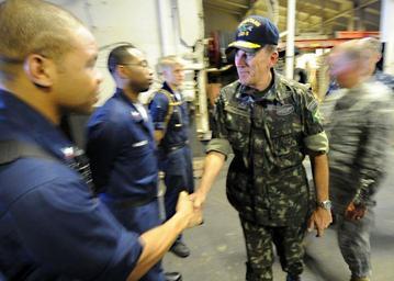 | Keywords: Haiti Relief DVIDS259697.jpg en Brazilian army Maj Gen Floriano Peixoto Vieira Neto right force commander of the U N Stabilization Mission in Haiti meets with Sailors aboard the amphibious assault ship USS Bataan Bataan is supporting Operation Unified Response after a 7 0 magnitude earthquake caused severe damage in and around Port-au-Prince Jan 12 2010-03-11 https //www dvidshub net/image/259697 100311-N-+++++-011 2010-03-13 16 24 PORT-AU-PRINCE HT PD-USGov-Military-Navy Operation Unified Response Images from DoD uploaded by Fæ Floriano Peixoto Vieira Neto |