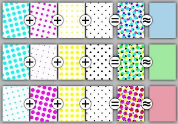 | Keywords: Halftoningcolor.svg Assessments 1 Halftone diagram 1 Three examples of color halftoning with CMYK separations From left to right The cyan separation the magenta separation the yellow separation the black separation the combined halftone pattern and finally how the human eye would observe the combined halftone pattern from a sufficient distance Halftoningcolor png 2009-01-06 21 00 UTC derivative work Pbroks13 <span class signature-talk >talk</span> Halftoningcolor png Slippens CMYK Printing Halftone |