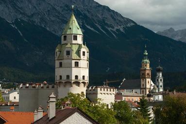 Keywords: halle in tirol austria mountains sky clouds church buildings trees forest woods city town architecture scenic outside tower münzerturm