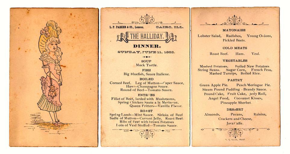 | Keywords: Halliday Hotel Dinner Menu 1882 Cairo, Illinois.jpg en This is an original 1882 dinner menu from the Halliday Hotel in Cairo Illinois The hotel was owned by the Halliday Brothers of Cairo Illinois During a period of the Civil War General Ulysses S Grant utilized the Halliday as his headquarters The Halliday was known across the country as one of the grandest hotels in Illinois 1882-06-11 E E Ellis Print Halliday Hotel Cairo Illinois L P Parker Co Lessees PD-old-70-1923 Uploaded with UploadWizard Hotels in Illinois |