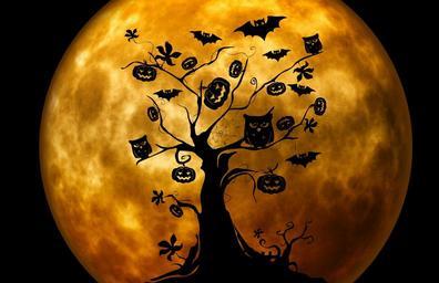 Keywords: halloween tree owl pumpkin weird surreal atmosphere bat moon silhouette