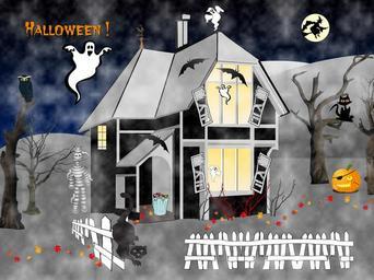 Keywords: halloween witch ghost pumpkin shutters house dead trees window fog bat leaves black cats moon trash owl