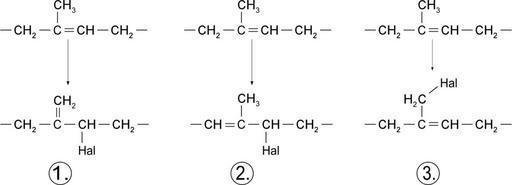 Keywords: Halobutyl rubber synthesis.png en The process No 1 takes place predominantly hu A halogénezett butilkaucsuk előállítása<br> Elsősorban az 1 számú reakció játszódik le a másik kettő kevéssé ru Получение галогени ованного бутилкаучука<br> П оисходит п еимущественно п оцесс 1 own kifo 2011-07-23 Rubber Cc-zero