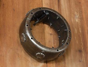 | Keywords: Halsring med taggar. Tortyrredskap - Skoklosters slott - 108895.tif LSH artwork sv Halsring av stål svartmålad Bestående av två halvor förenade genom gångjärn Vertikalt genom kragen är åtta hål borrade Någon slags nyckel eller järnten har ursprungligen tillhört kragen - låsanordningen öppnas då man trycker med någon syl i hålet närmast Invändigt är kragen försedd med 18 fastlödda taggar + 4 på vardera kraghalvan grupperade två och två intill kragens skarvar vilka kan tryckas in och hållas i detta läge genom att en ten stickes ner i närmaste hål På kragens utsida sex nitar med stora uddiga huvuden varje sådan nit omgiven av två mindre Insidan med en tandad kant upptill och nertill <br/>Enligt 1710 års inventarium p 72 rum III 1 Tursk Halsband af Jern med taggar inuthi som de bruka på Christna fångar original caption Halsring med taggar Tortyrredskap Turkisk krage <br/> Nyckelord Krage Föremålsbild Våld Kragar steel size mm 160 58 SKO place of origin original filename sm_dig5953 27219 inventory number SKO 7105 108895 CC-BY-SA Fredrik Andersson Collars Fredrik Andersson Media contributed by LSH unmatched keyword Media contributed by LSH 2016-05 |