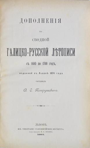 Keywords: Halytsky Chronicle by Petrushevich 1241.jpg Антін Пет ушевич Зведений Галицько-Руський літопис з 1600 по 1700 Львів 1874 Титульний а куш З особистої бібліотеки І Ф анка A Petrushevich Halytsky-Rusian summary chronicle from 1600 to 1700 year Lviv 1874 Title page From Ivan Franko personal Library 1874 Institution Shevchenko Institute of Literature Digital Collection PD-old-70-1923 Antonii Petrushevych 1874 books Franko Personal Library Collections of books in libraries in Ukraine Shevchenko Institute of literature Uploaded with VicuñaUploader |