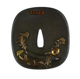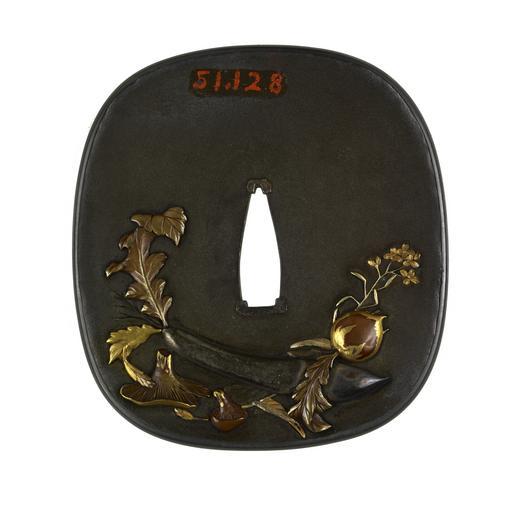 | Keywords: Hamano Noriyuki II - Tsuba with Basket of Fresh Seafood - Walters 51128 - Back.jpg On the front of this tsuba is a basket of sea food including a spiny lobster and a sea bream Both of these fish are considered celebratory and often eaten as part of New Year celebrations The basket also contains a squid and two additional fish On the back of the tsuba are mushrooms a daikon radish a turnip and a sprig of flowers between 1755 1787 Edo shibuichi gold and copper at bottom of nakago-ana cm 8 5 7 8 ; cm 0 46 d ; width at top of nakago-ana cm 7 4 accession number 51 128 15261 Henry Walters Baltimore date and mode of acquisition unknown Walters Art Museum Henry Walters Acquired by Henry Walters Signature Hamano Noriyuki place of origin Edo present-day Tokyo Japan Walters Art Museum license Tsuba in the Walters Art Museum Hamano Noriyuki II Media contributed by the Walters Art Museum needs category review |