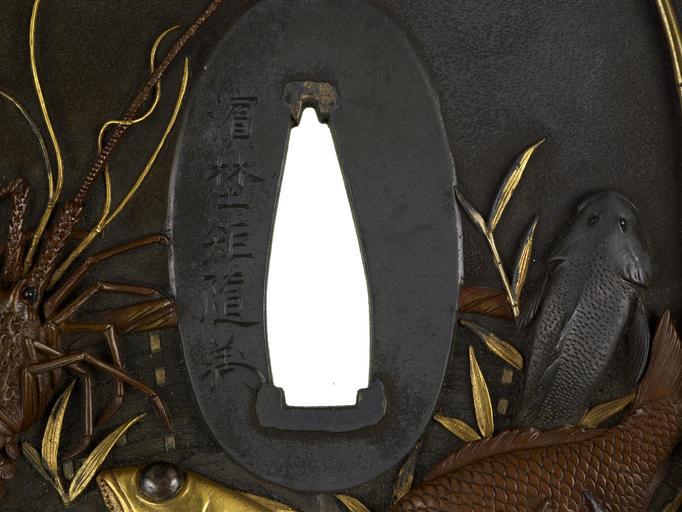 | Keywords: Hamano Noriyuki II - Tsuba with Basket of Fresh Seafood - Walters 51128 - Mark.jpg On the front of this tsuba is a basket of sea food including a spiny lobster and a sea bream Both of these fish are considered celebratory and often eaten as part of New Year celebrations The basket also contains a squid and two additional fish On the back of the tsuba are mushrooms a daikon radish a turnip and a sprig of flowers between 1755 1787 Edo shibuichi gold and copper at bottom of nakago-ana cm 8 5 7 8 ; cm 0 46 d ; width at top of nakago-ana cm 7 4 accession number 51 128 15261 Henry Walters Baltimore date and mode of acquisition unknown Walters Art Museum Henry Walters Acquired by Henry Walters Signature Hamano Noriyuki place of origin Edo present-day Tokyo Japan Walters Art Museum license Tsuba in the Walters Art Museum Hamano Noriyuki II Media contributed by the Walters Art Museum needs category review |