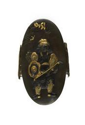 | Keywords: Hamano Noriyuki - Kashira with a Chinese Archer - Walters 51943.jpg Walters Art Museum artwork Creator Hamano Noriyuki A Chinese warrior is shown standing beneath a tree branch He holds a shield in his right hand and a bow on his left Arrows are in a quiver on his back This is part of a set with Walters 51 942 between 1793 1852 Edo shibuichi gold cm 3 3 accession number 51 943 23755 William T / Henry Walters Collection Baltimore date and mode of acquisition unknown Walters Art Museum Henry Walters Acquired by William T or Henry Walters none place of origin Edo present-day Tokyo Japan Walters Art Museum license Kashira in the Walters Art Museum Hamano Noriyuki Media contributed by the Walters Art Museum needs category review Hamano Noriyuki II |