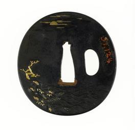 | Keywords: Hamano Noriyuki - Tsuba with the Chinese General Soso - Walters 51124 - Back.jpg The Chinese Three Kingdoms general Soso Ch Tsao Tsao is shown on his boat crossing the Yangtze River Under a full moon he stood before his soldiers with a spear in his hands and declared that they would be victorious at the coming battle After he spoke two crows flew overhead They are shown here in the upper left Crows are an sign of disaster Soso composed a poem about crows in an attempt to hide the bad omen but was defeated in his battle The reverse shows waves on the shore under a full moon between 1736 1787 Edo shibuichi gold cm 6 6 6 2 accession number 51 124 32919 Henry Walters Baltimore date and mode of acquisition unknown Walters Art Museum Henry Walters Acquired by Henry Walters Signature Hamano Noriyuki; Seal Noriyuki place of origin Edo present-day Tokyo Japan Walters Art Museum license Tsuba in the Walters Art Museum Hamano Noriyuki Media contributed by the Walters Art Museum needs category review |