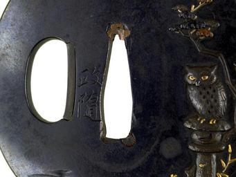 | Keywords: Hamano Shôzui - Tsuba with an Owl on a Stone Lantern - Walters 51238 - Mark A.jpg Across the top of this tsuba an openwork area forms clouds with the moon on the left On the right an owl sits on a stone garden lantern under a tree Bamboo and other plants surround the owl On the reverse are reeds and a stream between 1696 1769 Edo shibuichi gold cm 6 36 6 0 38 accession number 51 238 27301 Henry Walters Baltimore date and mode of acquisition unknown Walters Art Museum Henry Walters Acquired by Henry Walters Signature Shôzui place of origin Edo present-day Tokyo Japan Walters Art Museum license Tsuba in the Walters Art Museum Hamano Shôzui Media contributed by the Walters Art Museum needs category review |