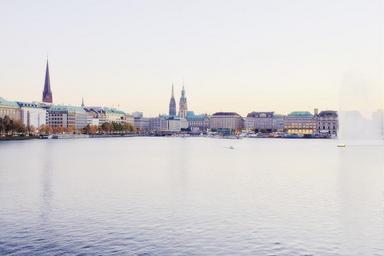 Keywords: hamburg alster water innenalster germany sunset abendstimmung high key city view pastel views sky