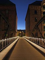 Keywords: hamburg bridge speicherstadt building homes architecture night photograph abendstimmung