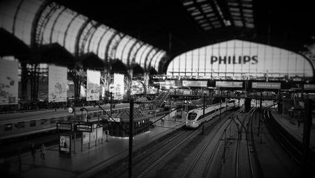 Keywords: hamburg central station platform railway station lobby railroad track black and white