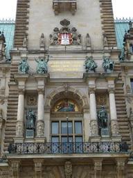 Keywords: hamburg hanseatic city architecture landmark historically town hall building tower facade town hall tower statue sculpture coat of arms balcony monument