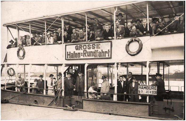 | Keywords: germany hamburg 1938 german topographical hafen rundfahrt tourismus hafenrundfahrt schiff elbe hadag fähre transport public domain publicdomain monochrome shop Nice to have a precisely dated photograph. And this at the time when events that were to lead to World War 2 were just kicking off ( en.wikipedia.org/wiki/1938 ), and exactly on this day Italy was banning all Jewish teachers from schools ( www.brainyhistory.com/events/1938/august_21_1938_96692.html ). But 'normal' life continued in Hamburg in would appear, as it did in England too - two days later England scored 903 for 7 in the cricket against Australia ( www.brainyhistory.com/days/august_23.html )! You do have to wonder what happened to these folk in the years that followed. This is a real photo postcard and on the reverse it states: "Hamburger Foto-Werrkstatten Greite & Lober, Hamburg, Landungsbrucken. Bei Nachbestellungen bitte die umseitige Nr. und Datum augeben" The last bit basically means you can reorder copies by giving the number and date on the front. Nice to have a precisely dated photograph. And this at the time when events that were to lead to World War 2 were just kicking off ( en.wikipedia.org/wiki/1938 ), and exactly on this day Italy was banning all Jewish teachers from schools ( www.brainyhistory.com/events/1938/august_21_1938_96692.html ). But 'normal' life continued in Hamburg in would appear, as it did in England too - two days later England scored 903 for 7 in the cricket against Australia ( www.brainyhistory.com/days/august_23.html )! You do have to wonder what happened to these folk in the years that followed. This is a real photo postcard and on the reverse it states: "Hamburger Foto-Werrkstatten Greite & Lober, Hamburg, Landungsbrucken. Bei Nachbestellungen bitte die umseitige Nr. und Datum augeben" The last bit basically means you can reorder copies by giving the number and date on the front. |