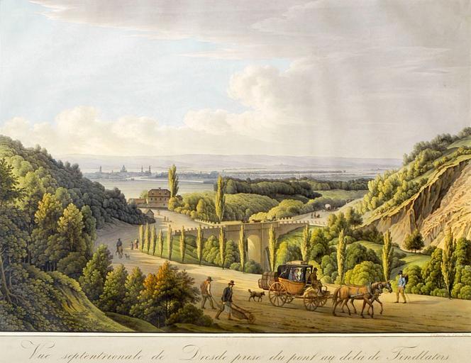 Keywords: Hammer CG (C19)Dresden.jpg Bild-Beschreibung / description of picture 10 top right style background 87CEFF Titel / Title Nördlicher Blick auf Dresden - valign top right style background 87CEFF Beschreibung / Description Blick von den Besitzungen Lord Findlaters am Hirschberg nördlich von Dresden In der Bildmitte die Mordgrundbrücke die über den Stechgrund einen Ausläufer der Dresdner Heide führt Im Hintergrund die historische Silhoutte Dresdens Alt-aquarellierter Umrißstich View from the vineyard of James Ogilvy 7th Earl of Findlater northerly from Dresden in Germany In the middle of the picture the Mordgrund-Bridge in the background the historic Skyline of the Dresden City Outline etching in old original color top right style background 87CEFF Autor / Artist gezeichnet und gestochen / painting and etching Christian Gottlob Hammer 1779-1864 top right style background 87CEFF Quelle / Source http //www saxonia com Galerie SAXONIA München; Objekt-Nr 006181 top right style background 87CEFF Datum / Date nach 1828 top right style background 87CEFF Lizenz / License PD-old Christian Gottlob Hammer Stone arch bridges in Dresden Stone arch bridges in art Dresdner Heide Images from Galerie Saxonia