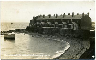 | Keywords: Hampton on Sea 1910 124.jpg Postcard dated 1910 showing the back of Hernecliffe Gardens terrace in the process of sea erosion Photographed looking north-east The photographer was standing on the shore as it was then; the shore has moved southward since Some interesting points are 1 another wrecked building further out to sea no longer existing ; 2 the height of the original cliff and buildings above the sea wall on the left which still exists in part; 3 two men standing in the backyard of the furthest house; 4 washing on a line and a mangle remaining behind the middle house which appears to be covered in seaweed at the back indicating a recent storm Border The remaining border of this image is important for researchers of this photographer Some photographers trimmed their images more than others and Palmer has a reputation for producing smaller postcards than other early 20th century UK photographers He took his own photos developed them in-house onto postcard-backed photographic paper and trimmed them himself It is worth adding that during hand-developing the border is actively masked with equipment which both crops the picture and causes the white frame or border to appear on the paper This frame is part of the design and is one of the reasons why the quality of Palmer's work is so interesting and why there is an article and category for him on English Wiki Researchers need to see exactly where the edge of the postcard is This postcard has no white frame but the edge of the card is the edge of the composition Thank you for taking the time to read this Scan of postcard 1910 unknown although it could possibly be Fred C Palmer d 1930s because the date subject style and white writing are similar to his other work However Fred C Palmer's postcards usually had his name on the back and this one has no name out of copyright Other views of the same subject are File Hampton-on-Sea 1910 023 jpg and File Hampton on Sea 1911 125 jpg PD-old-70-1923 Hampton-on-Sea Erosion in the United Kingdom Disasters Buildings in Kent Fred C Palmer of Herne Bay |