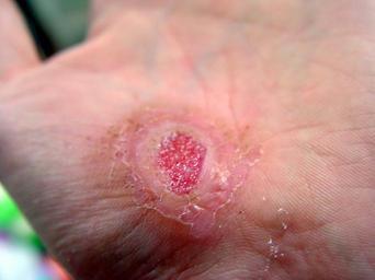 Keywords: Hand Abrasion - 13 days 15 hours 30 minutes after injury.JPG en Abrasion caused by sliding fall on concrete own Jpbarrass 2008-11-21 Abrasion medical Wound healing