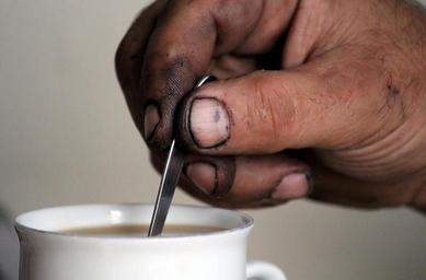 Keywords: hand mechanic coffee break cup stir spoon coffee hot drink break rest switch off leisure work car resourceful oily dirty