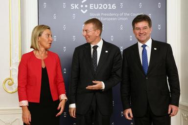 | Keywords: eu2016sk eu ec europe reduta foreign affairs ministers presidency pressk bratislava informal meeting slovakia Mrs. Federica Mogherini, European external Action Service, High Representative of the Union for Foreign Affairs and Security Policy/Vice- President of the Commission (L), Latvia, Mr. Edgars Rinkevics, Minister of foreign Affairs (C), Slovakia, Mr. Miroslav Lajcak, Minister of foreign and European Affairs (R) Informal Meeting of foreign Affairs Ministers (Gymnich) Photo: Andrej Klizan Mrs. Federica Mogherini, European external Action Service, High Representative of the Union for Foreign Affairs and Security Policy/Vice- President of the Commission (L), Latvia, Mr. Edgars Rinkevics, Minister of foreign Affairs (C), Slovakia, Mr. Miroslav Lajcak, Minister of foreign and European Affairs (R) Informal Meeting of foreign Affairs Ministers (Gymnich) Photo: Andrej Klizan Mrs. Federica Mogherini, European external Action Service, High Representative of the Union for Foreign Affairs and Security Policy/Vice- President of the Commission (L), Latvia, Mr. Edgars Rinkevics, Minister of foreign Affairs (C), Slovakia, Mr. Miroslav Lajcak, Minister of foreign and European Affairs (R)
