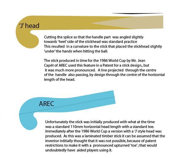 Keywords: Handle Curve & AREC.jpg The angle to the 'heel' side of a hocky stick due to the angle of insertion of the handle part to the head part in timber constructions The use by Mr Jean Capet of this feature to patent a design where the centre line of the handle could be projected through the centre of the head of the stick 2006-09-24 own assumed Martin ZigZag Field hockey sticks |