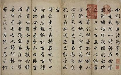 | Keywords: Handwritten diamond sutra zhang jizhi song dynasty 1253.jpg Zhang Jizhi made this handwritten edition a section depicted of the Diamond Sutra on 18 July 1253 during the Song dynasty The calligraphy is in the style of the regular script with elements of the running script The Indian monk Kumarajiva 344-415 was the translator of the Diamond Sutra from Sanskrit into Chinese Kumarajiva's translated text was used by Zhang Jizhi in making the depicted work 18 July 1253 Song dynasty National Palace Museum http //www npm gov tw/exh94/buddha/english_version/subject01 html The Opening of Prajñā Wisdom The Buddha Light Illuminating All Treasured Buddhist Scriptures and Paintings from the Museum Collection exhibit Taipei National Palace Museum http //www npm gov tw/exh99/southernsong/en_04 html Life Aesthetic Dynastic Renaissance Art and Culture of the Southern Song exhibit Taipei National Palace Museum object history exhibition history credit line http //www npm gov tw/exh94/buddha/english_version/subject01 html The Opening of Prajñā Wisdom The Buddha Light Illuminating All Treasured Buddhist Scriptures and Paintings from the Museum Collection exhibit Taipei National Palace Museum accession number Custom license marker 2013 09 18 PD-old-100 Uploaded with UploadWizard Collections of the National Palace Museum Chinese calligraphy Diamond Sutra Buddhism in China |