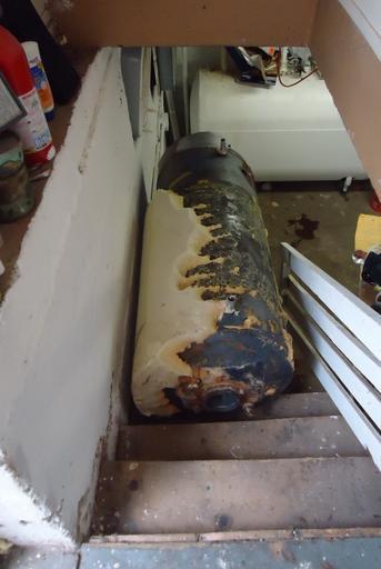 Keywords: Handyman project to disassemble hot water heater 23.JPG en View from the top of the basement stairs looking down at a 200 pound slimmed-down hot water heater Photo from a project to remove a bulky heavy non-needed 75 gallon hot water heater from a basement 2013-02-25 22 34 13 own Tomwsulcer cc-zero Uploaded with UploadWizard Water heating devices Handyman photos by tom sulcer Stairs |