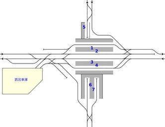 | Keywords: Hankyu Nishinomiya-kitaguchi station track map.svg en Track map of Hankyu Railway Nishinomiya-kitaguchi station in Nishinomiya Hyogo Japan ja 阪 西宮北口駅配線図 鉄道ピクトリアル 2010年8 臨時増刊号巻 付属の阪 電鉄線路配線略図を基に 5号線高架化後の状況を 足した上で 成 own Matsukaze Rail track diagrams of Hankyu Railway train stations Nishinomiya-Kitaguchi Station |