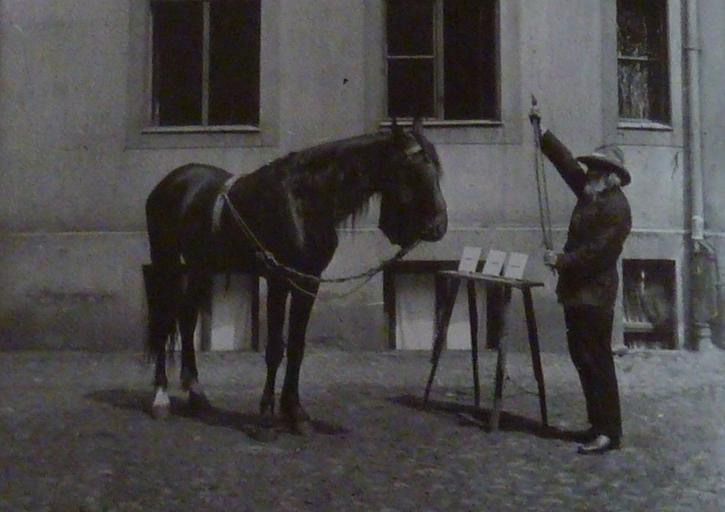Keywords: Hans lernt krumm und gerade.jpg Der kluge Hans lernt den Unterschied zwischen gerade und krumm Karl Krall Denkende Tiere S 46 1909 oder früher Karl Krall s u PD-old Clever Hans Black and white photographs of Germany
