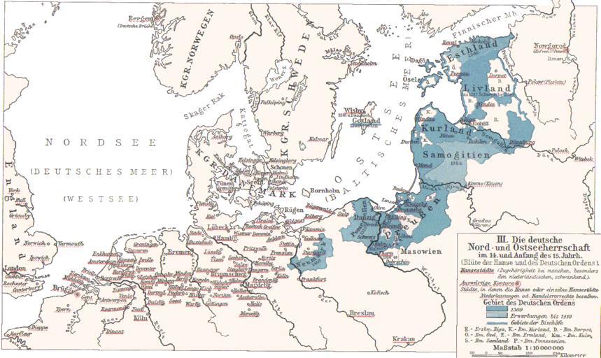 | Keywords: Hanse-Orden.png This map depicts German rule of North and Baltic Sea in 14th and early 15th century during the height of Hanseatic League and Teutonic Order Hanse cities underlined in red Ordensstaat possessions until 1410 marked in blue colors with year of acquisition Lands of the bishoprics are marked with first letter Pomesanien Kulm Km Ermland Samland in Prussia Riga Kurland Ösel Dorpat in the North East Towns of Hanseatic League are underlined in red Die deutsche Nord-und Ostseeherrschaft im 14 und Anfang des 15 Jahrhunderts während der Blüte von Hanse und Deutscher Ordnen Aus Putzgers historischer Weltaltlas 1901 Deutsche Legende im Bild Originally from 1901 edition of Putzgers Historischer Schul-Atlas and uploaded to Hanse jpg as 100+ year old Public Domain by de Benutzer Olbertz Improved quality and reduced file size by Matthead See also http //www maproom org/00/01/present php m 0036 at maproom org PD-old Germany in the 15th century Maps of Hanseatic League Old maps of Europe State of the Teutonic Order Putzgers Historischer Schul-Atlas |