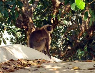 Keywords: hanuman langur monkey jamun tree syzigium cumini blackberry tree dharwad roof top india