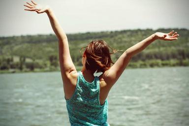 Keywords: happiness back side woman young girl person attractive cheerful joy lady raising hands fun expression emotions expressing