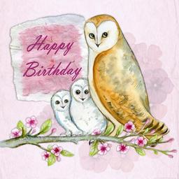 Keywords: happy birthday greeting card owls cute pink feminine floral branch happy birthday card happy gift celebration day birthday party present romantic square celebrate baby owl event message